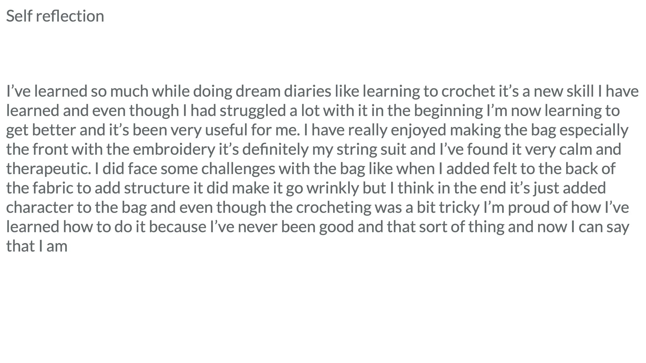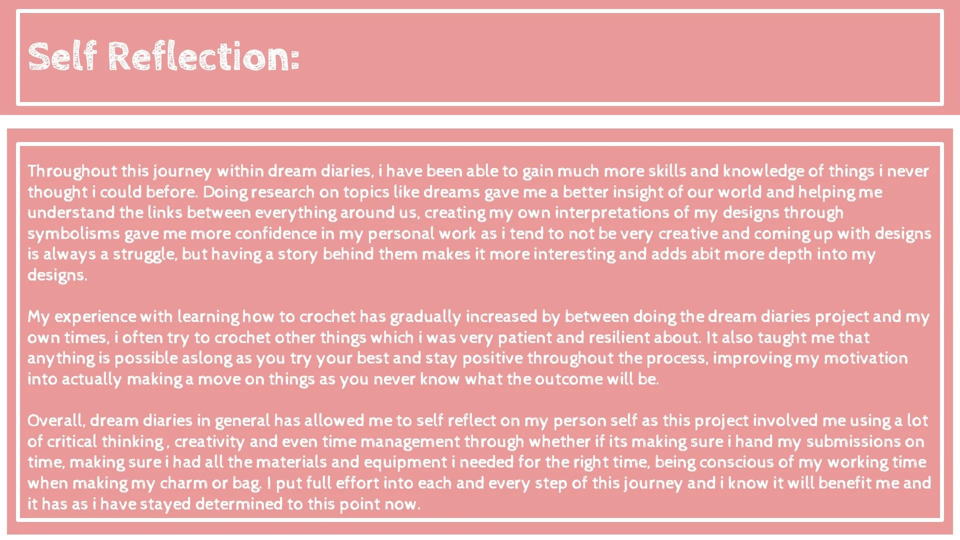 “i have personally achieved becoming a critical independent worker, being expected to do this big project i have never done before had me feeling unsure but in the end, i was able to finish it with my highest efforts.”